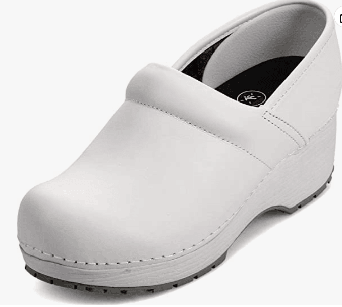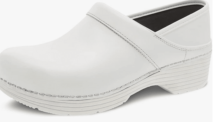 If you’re looking for a super simple, basic white clog for nurses, look no further than this clog from Dansko. It’s a basic slip-on design with a roomy reinforced toe box for added comfort.