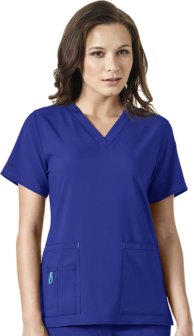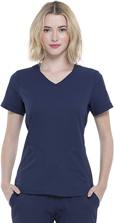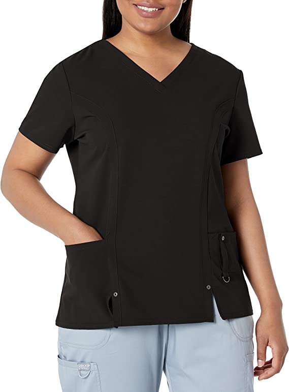 The Dickies Xtreme Stretch Women’s V-Neck Scrub top features princess seams which give this scrub top a feminine and flattering fit. The front of the top also features two vents to make the top breathable while adding style. This top is made of soft polyester, spandex, and rayon blend which makes the top stretchy and comfortable. A wide variety of colors and sizes are available on Amazon, from XXS to 5X.