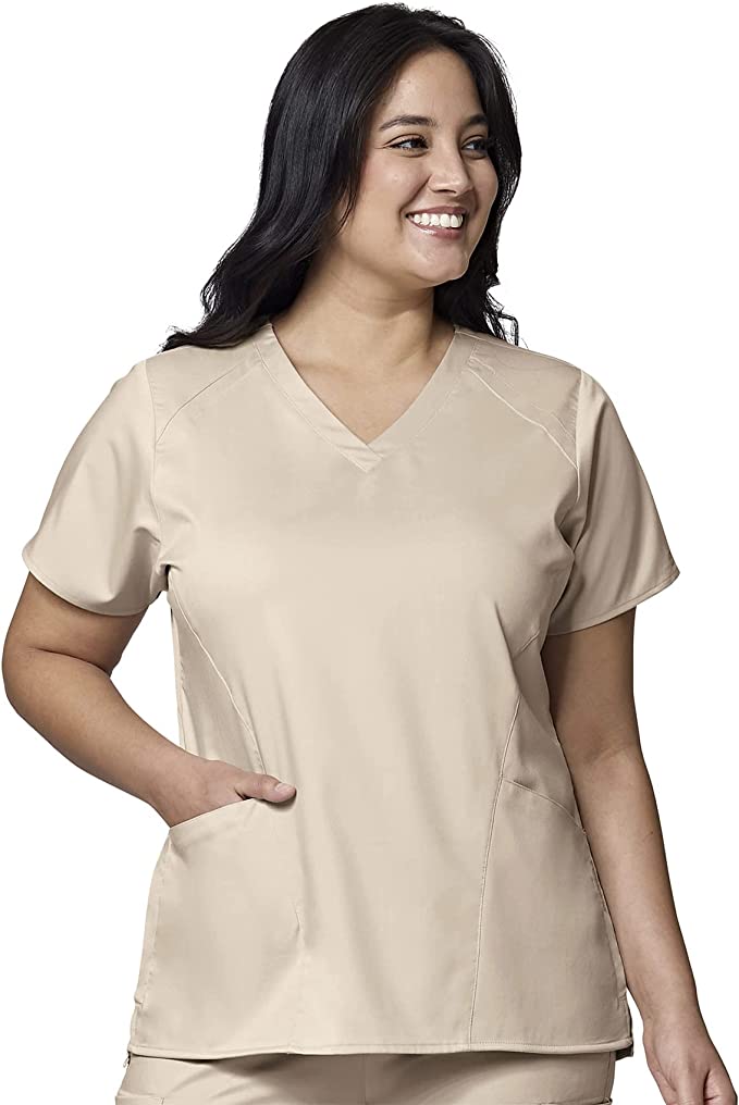 The WonderWink Pro Women’s 4-pocket V-neck Scrub Top features a trendy, subtle high-low hemline, slanted front pockets, side vents, and a dropped shoulder which give this scrub top a contoured shape while remaining comfortable. The polyester, rayon, and spandex fabric blend is soft and comfortable and comes in sizes from XXS to 5X.