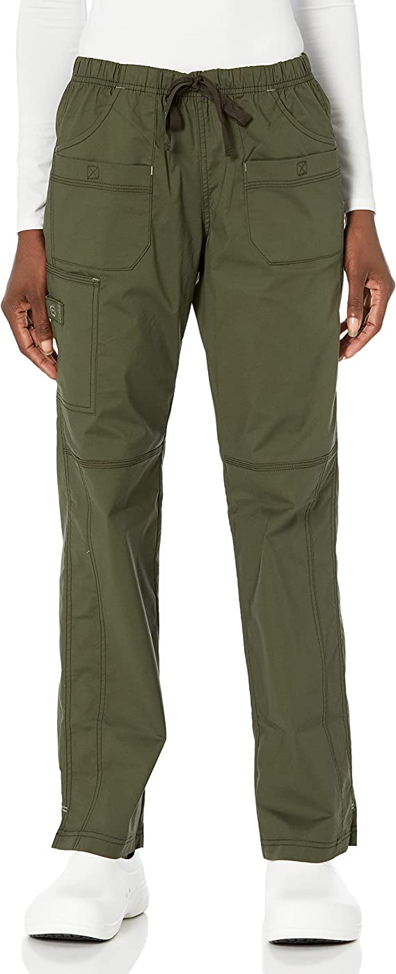 Key features: Cargo scrub pants, spandex, drawstring waist