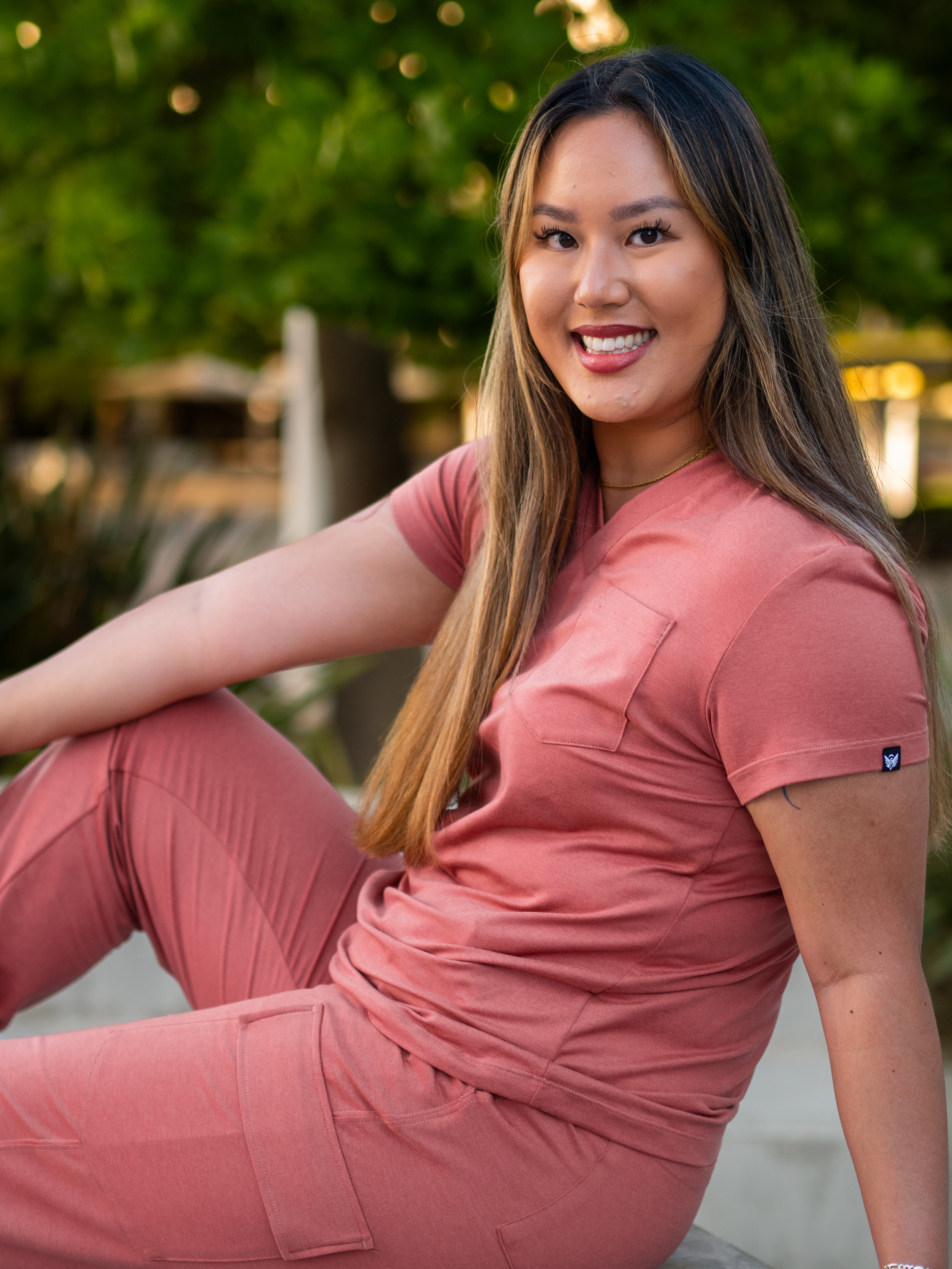 Soleya scrubs are nurse-owned & Made in the USA. Beth Guynes, BSN, RN started Soleya Scrubs to combine the comfort of brands like Vuori and Lululemon with the style of brands like Reformation and Aritzia.
