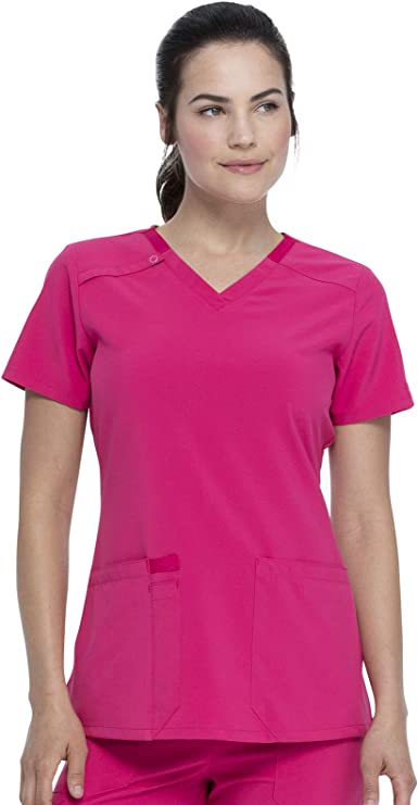 The Dickies Xtreme Stretch Women’s V-Neck Scrub top features princess seams which give this scrub top a feminine and flattering fit. The front of the top also features two vents to make the top breathable while adding style. This top is made of soft polyester, spandex, and rayon blend which makes the top stretchy and comfortable. A wide variety of colors and sizes are available on Amazon, from XXS to 5X.